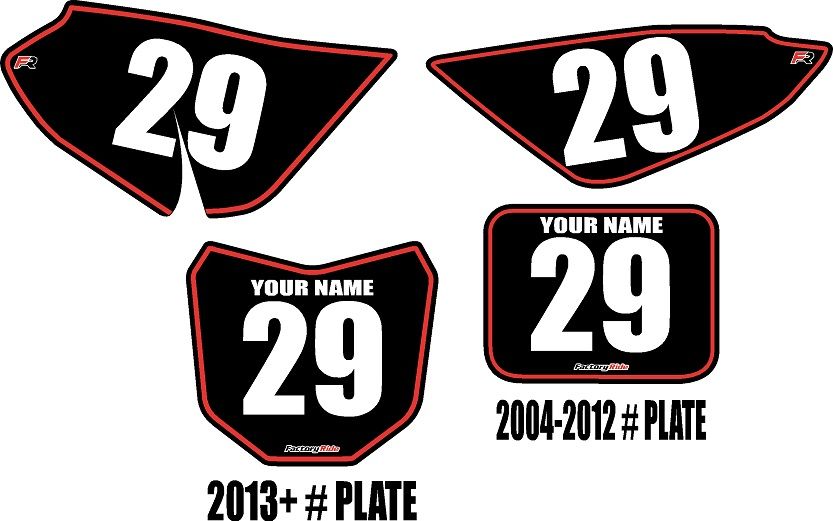 Comes with 1- Right Side Panel, 1- Left Side Panel, and 1- Front Number Plate (2004-2012 or 2013-2026) Decal plus 2 Free mini plate decals of 2013-2026 Front Plate not shown.