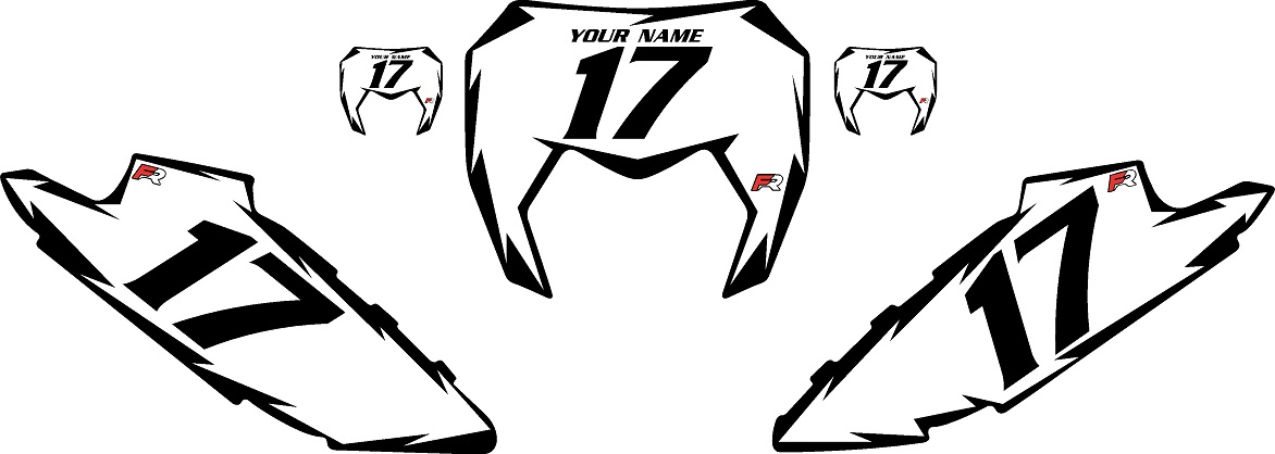 Comes with 1- Right Side Panel, 1- Left Side Panel, and 1- Front Number Plate Decals plus 2 Free mini plate decals as shown.