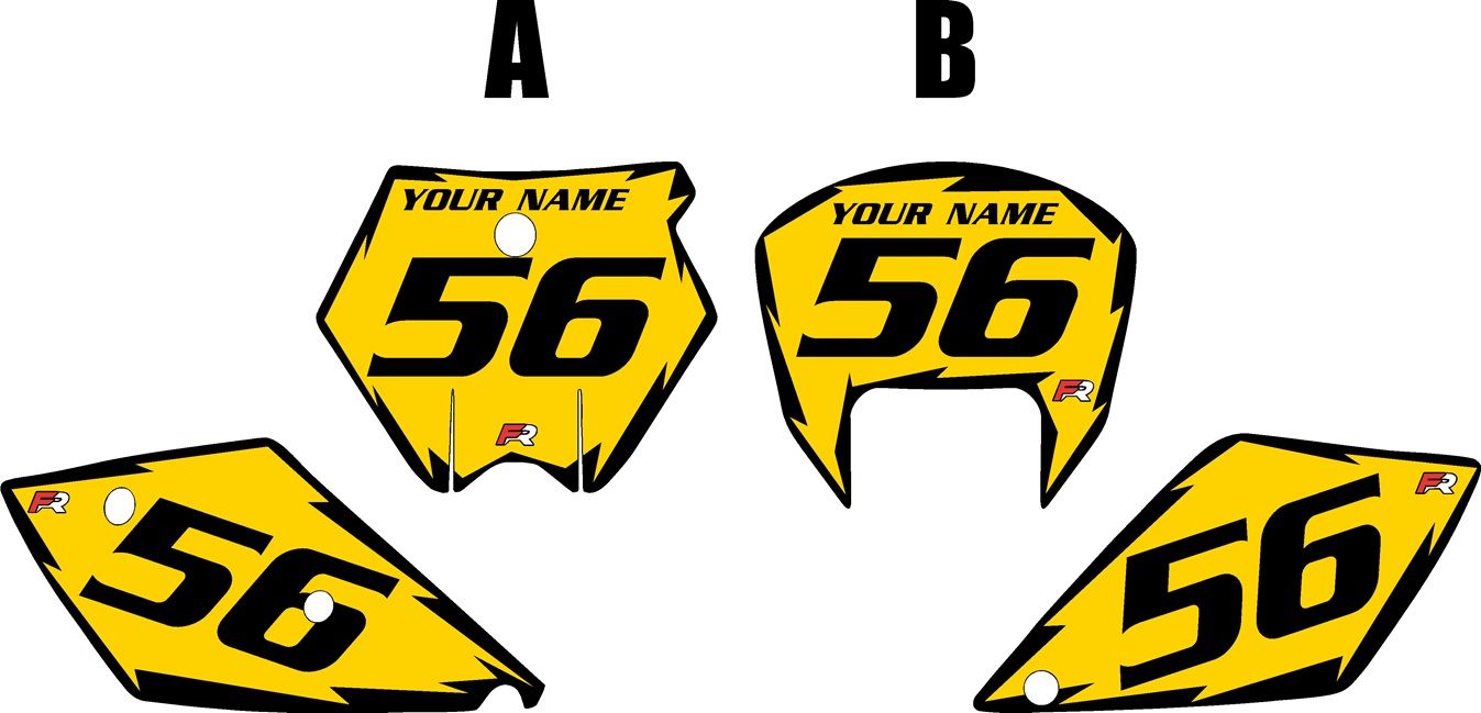Comes with 1- Right Side Panel, 1- Left Side Panel, and 1- Front Number Plate (Option A, or Option B) Decals plus 2 Free mini plate decals not shown.