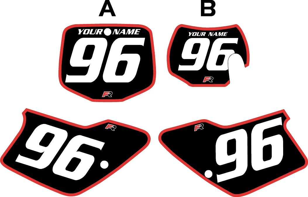 Comes with 1- Right Side Panel, 1- Left Side Panel, and 1- Front Number Plate (Option A OR Option B) Decals plus 2 Free mini plate decals as shown.