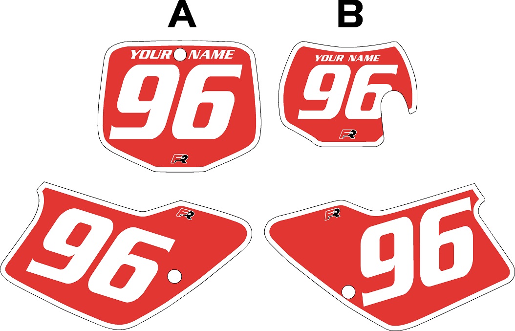 Comes with 1- Right Side Panel, 1- Left Side Panel, and 1- Front Number Plate (Option A OR Option B) Decals plus 2 Free mini plate decals as shown.