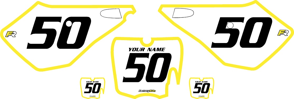 Comes with 1- Right Side Panel, 1- Left Side Panel, and Front Number Plate Decals plus 2 Free mini plate decals shown.