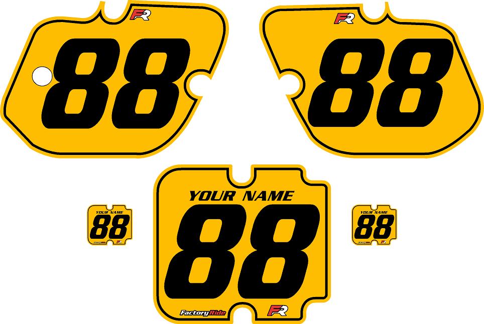 Comes 1- Front Number Plate, 1- Right Side Panel, and 1- Left Side Panel Decals. Also includes 2 Free mini plates as shown.