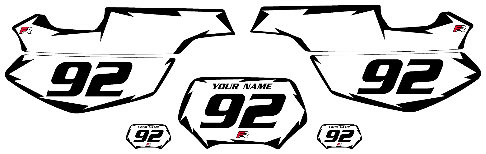 Comes with 1- Right Side Panel, 1- Left Side Panel, and Front Number Plate Decals plus 2 Free mini plate decals shown.